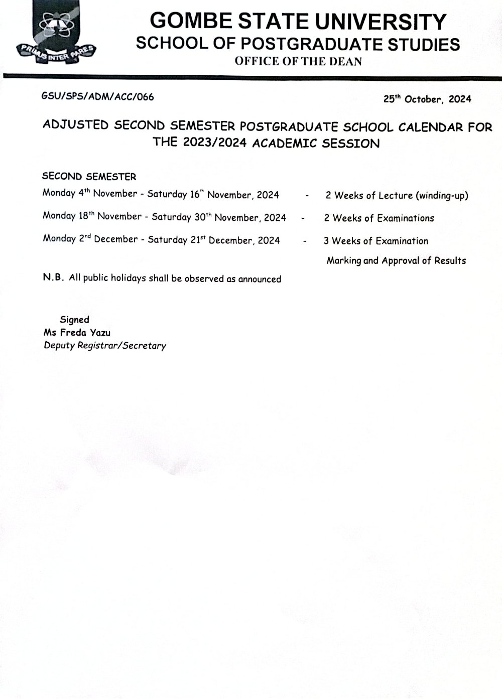 Adjusted Calendar for 2023/2024 Academic Session
